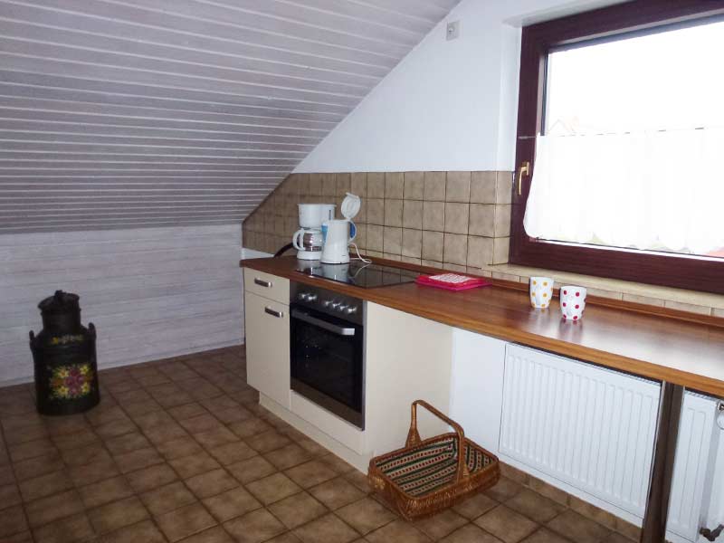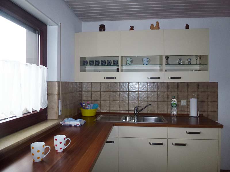 Die gut ausgestattete Einbauküche beinhaltet einen Herd mit Ceranplatte und Backofen, eine Arbeitsplatte am Fenster, eine Spüle mit zwei Becken, Microwelle und einen Kühlschrank mit Tiefkühlfach. Unter anderem sind eine Kaffeemaschine, ein Wasserkocher, ein Toaster und ein Handrührgerät vorhanden.