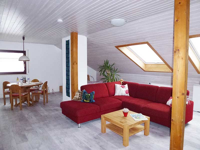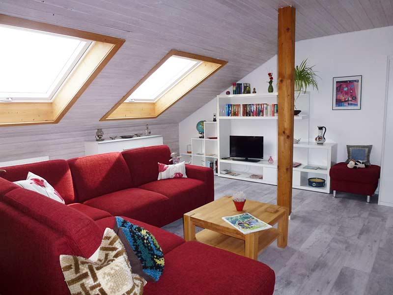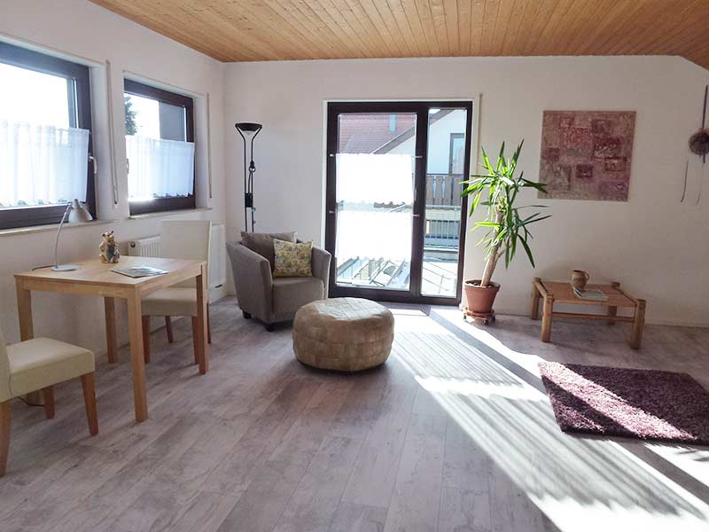 Das geräumige 38 qm große Wohn- Schlafzimmer ist mit einer Wohnlandschaft, einem runden Esstisch, einem weiteren Bett mit 1,40 m Breite und einem Medienregal mit Radio und LCD-Fernsehgerät mit Kabel-TV eingerichtet. Ein Telefon steht für Inlandsgespräche kostenlos zur Verfügung.